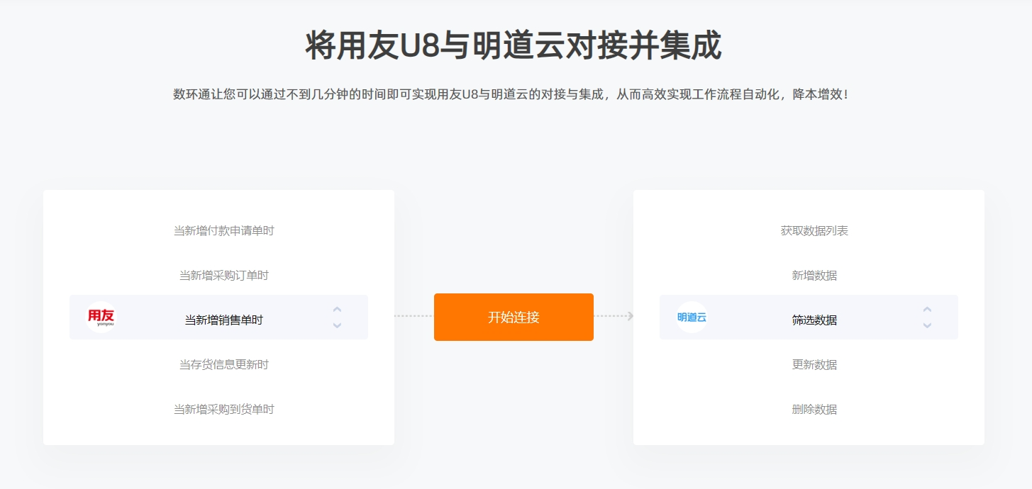 用友提供了人、財、物、客一體化數字管理解決方案,明道云則是一個APaaS平臺,幫助企業快速搭建個性化業務應用。那么如何實現兩個應用的對接從而實現企業協同化發展,建立自動化業務流程。數環通打通了用友和明道云的對接,下面介紹用友和明道云的集成對接應用場景示例。
