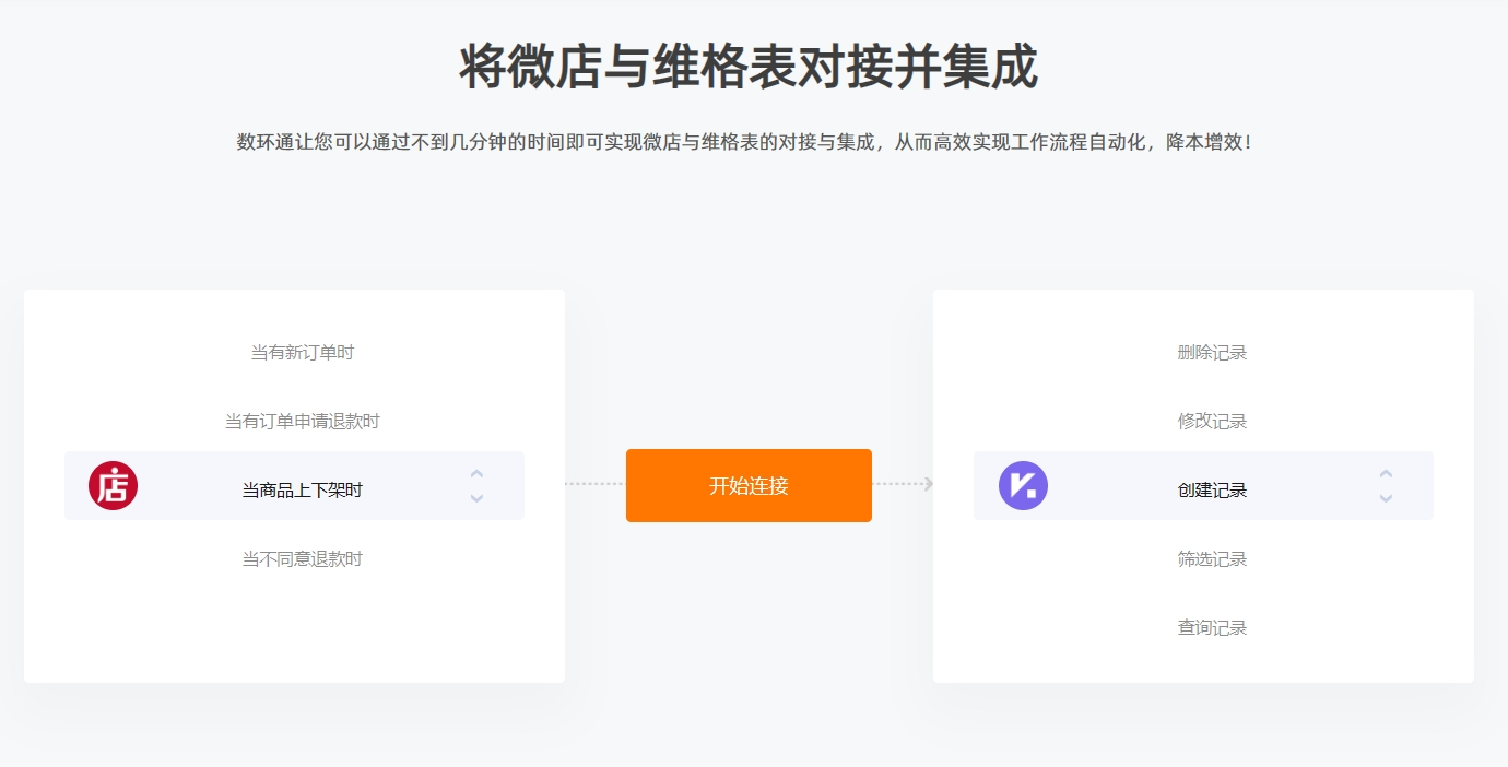 微店,從工具到流量,一站式解決社交網絡開店的所有問題,vika維格表,國內領先的多維表產品,若用傳統的方式切換二者實現數據的連接,費時費力,而通過數環通數據連接器,可以輕松實現二者的對接,實現快速數據共享同步,提高企業效率,節省人力物力。下面介紹微店和維格表的集成對接應用場景示例。
