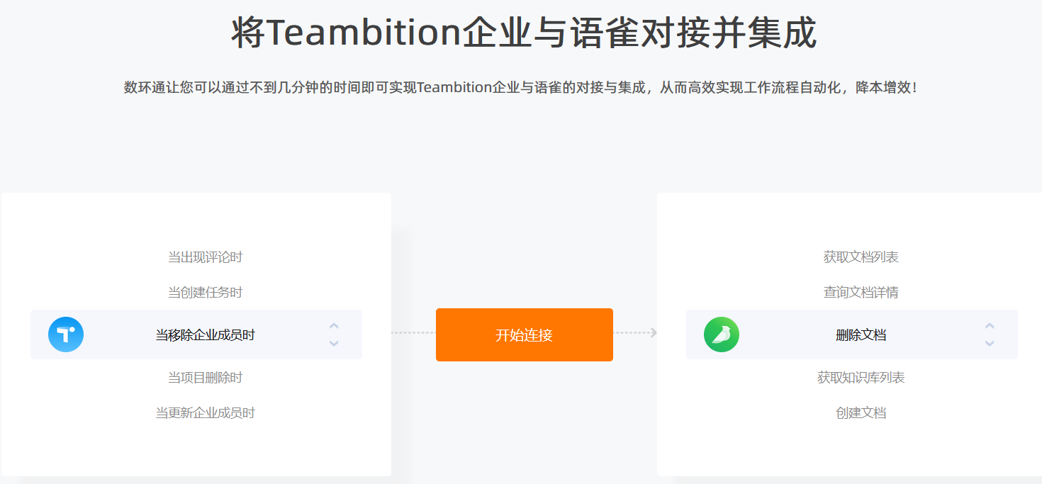 通過數(shù)環(huán)通,您可以使用不到幾分鐘的時間即可實(shí)現(xiàn)語雀與Teambition企業(yè)的對接與集成,從而高效實(shí)現(xiàn)工作流程自動化,降本增效!