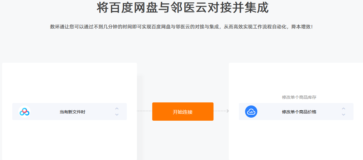 通過數環通,您可以使用不到幾分鐘的時間即可實現鄰醫云與伙伴云的對接與集成,從而高效實現工作流程自動化,降本增效!