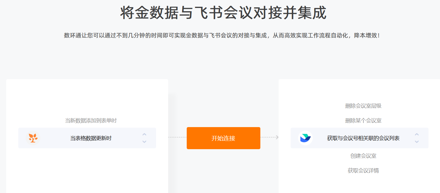 通過(guò)數(shù)環(huán)通,您可以使用不到幾分鐘的時(shí)間即可實(shí)現(xiàn)飛書會(huì)議與金數(shù)據(jù)的對(duì)接與集成,從而高效實(shí)現(xiàn)工作流程自動(dòng)化,降本增效!