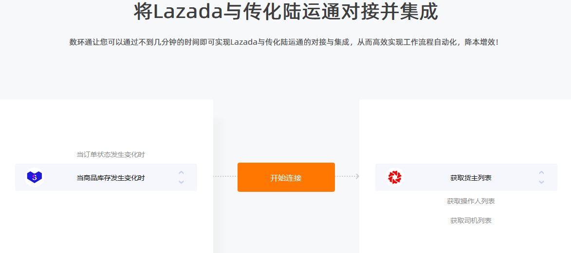 通過(guò)數(shù)環(huán)通,您可以使用不到幾分鐘的時(shí)間即可實(shí)現(xiàn)傳化陸運(yùn)通與Lazada的對(duì)接與集成,從而高效實(shí)現(xiàn)工作流程自動(dòng)化,降本增效!